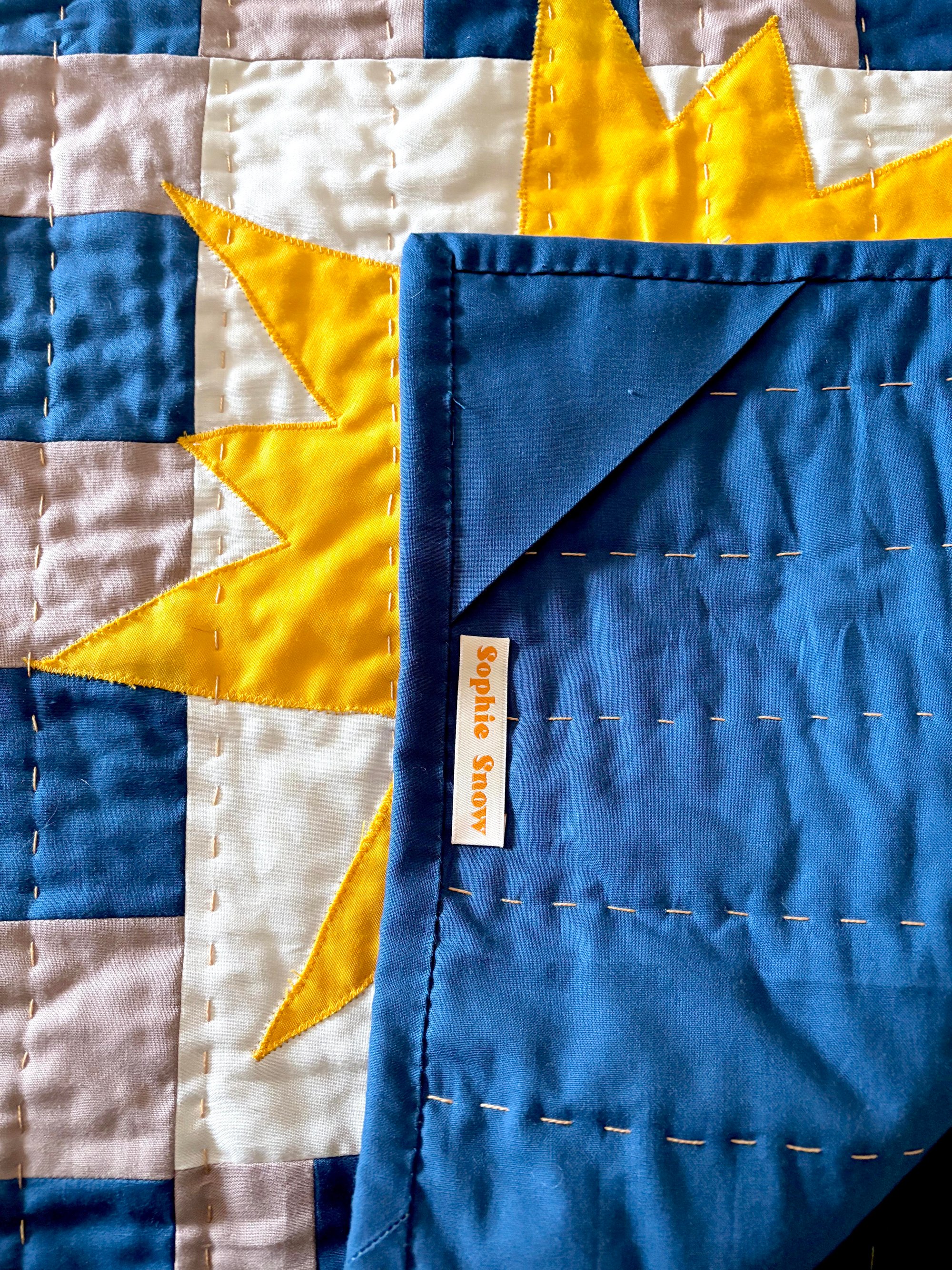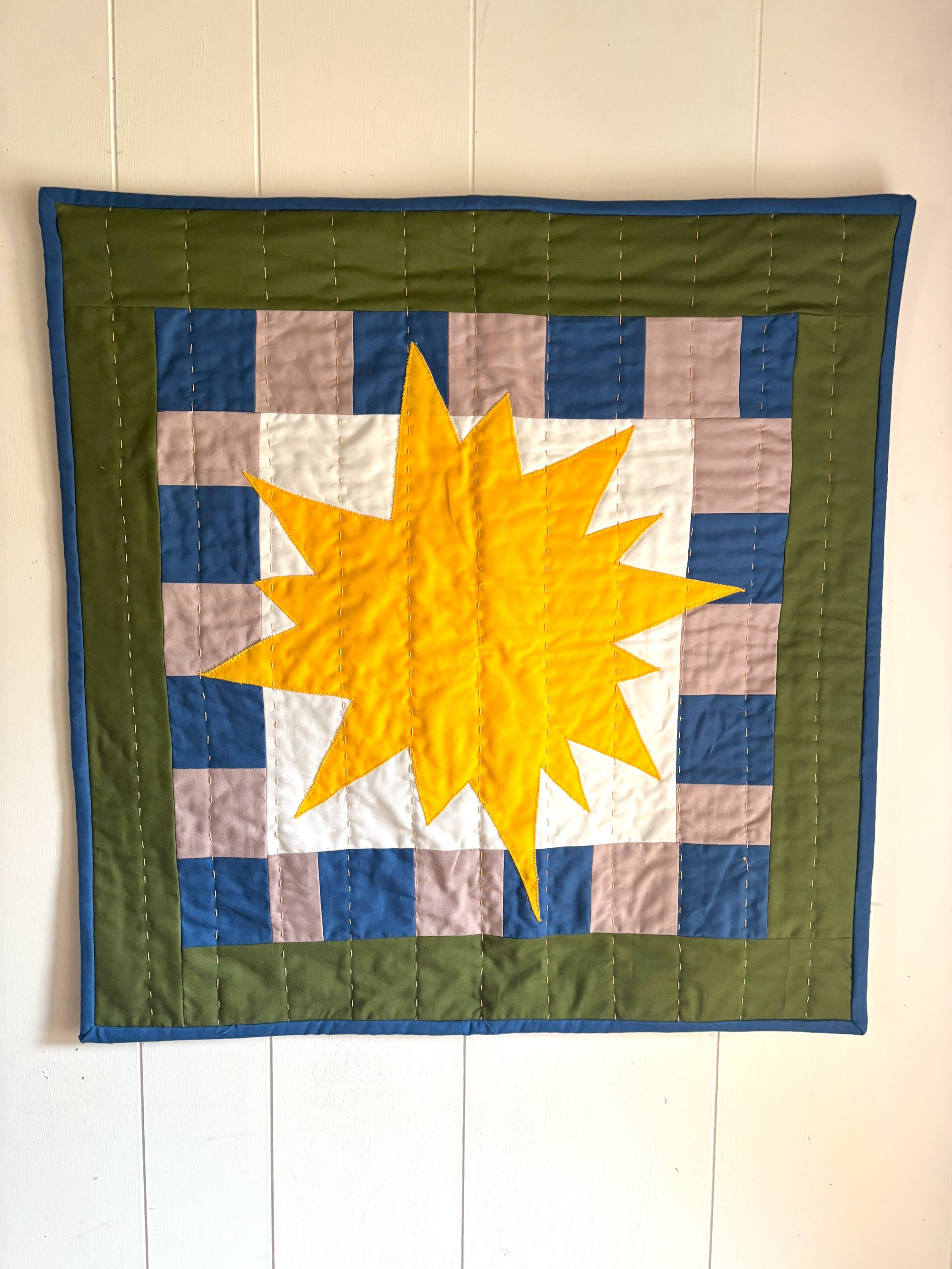 Add warmth, character, and a touch of artistry to your home with our bespoke quilted wall hangings. Each piece is thoughtfully crafted, combining the precision of machine appliqué with the intricate beauty of hand stitching. Our lovely bright spark motif is very popular in our designs.