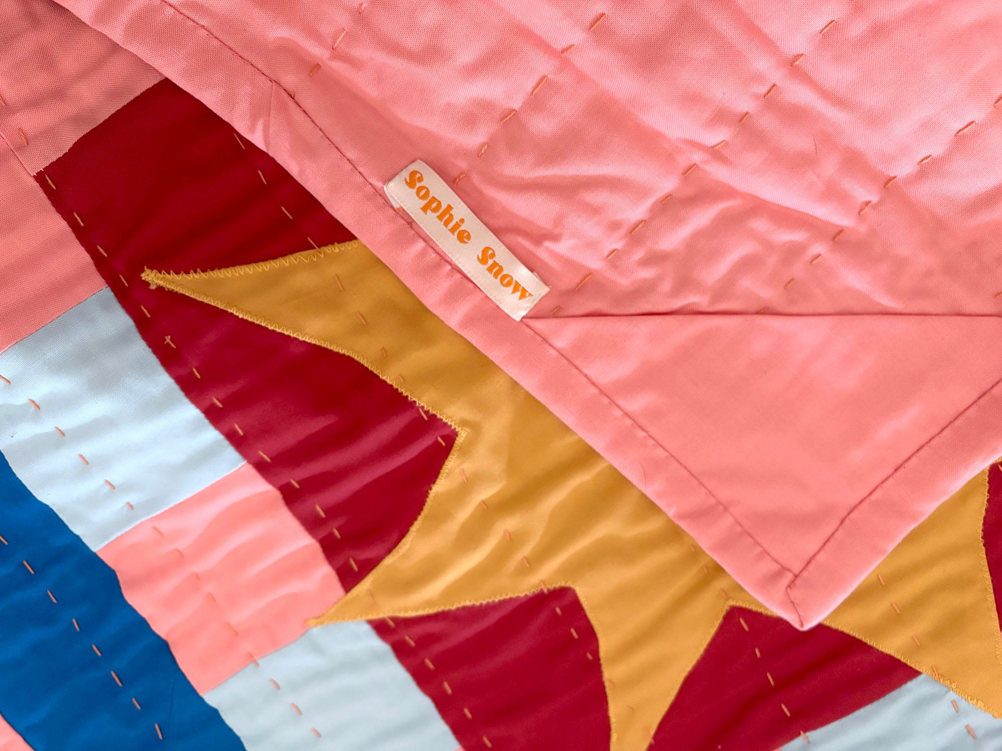 Add warmth, character, and a touch of artistry to your home with our bespoke quilted wall hangings. Each piece is thoughtfully crafted, combining the precision of machine appliqué with the intricate beauty of hand stitching. Our lovely bright spark motif is very popular in our designs. This one is a double so extra motif and length for extra wow.